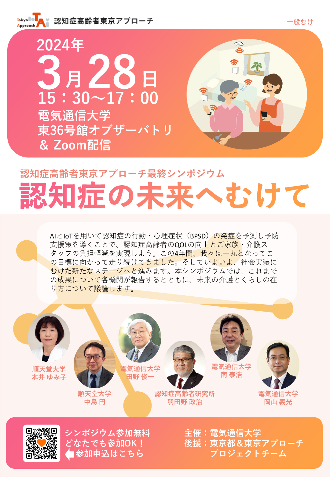 2024年3月28日(木)15:30~17:00 電気通信大学 東36号館オブザーバトリ&Zoom配信 講演予定: 電気通信大学 田野 俊一 学長 電気通信大学 南 泰浩 教授 順天堂大学 本井 ゆみ子 教授、中島 円 准教授 認知症高齢者研究所 羽田野 政治 所長 東京都 総合討論(ファシリテーター:電気通信大学 岡山 義光 理事) 参加費:無料 申込み:参加申し込みはこちら